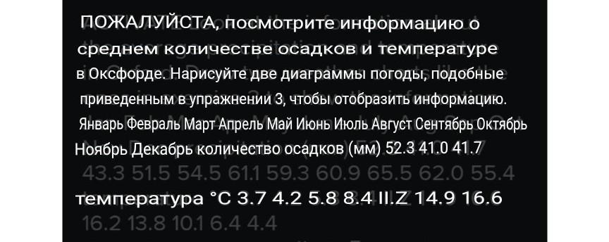 ACTIVATE Look at the information about the average precipitation and temperature in Oxford. Draw two weather charts like the ones in exercise 3 to show the information. Jan Feb Mar Apr May June July Aug Sep Oct Nov Dec precipitation (mm) 52.3 41.0 41.7 43.3 51.5 54.5 61.1 59.3 60.9 65.5 62.0 55.4 temperature °C 3.7 4.2 5.8 8.4 II.Z 14.9 16.6 16.2 13.8 10.1 6.4 4.4