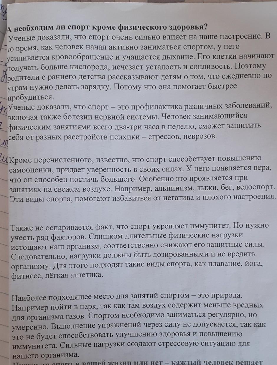 Здесь рассказывает о спорте. Когда человек начинает активно заниматься спортом,у него учащается дыхание.исчезает усталость. Для меня здесь наиболее важная информация"Пойти в парк,так как там воздух содержит меньше вредных для организма газов".