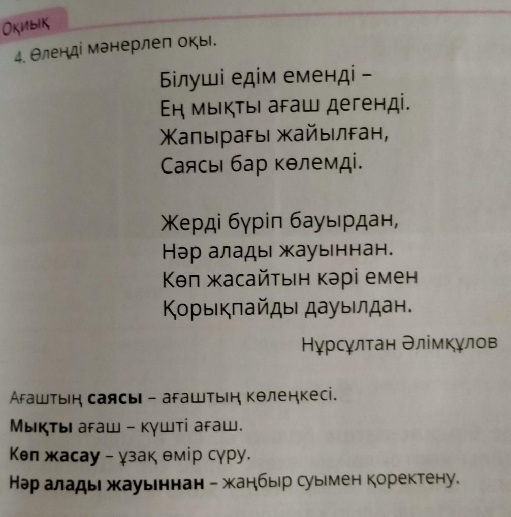 Оқиыл 4. Өлеңді мәнерлеп оқы. Білуші едім еменді - Ең мықты ағаш дегенді. Жапырағы жайылған, Саясы бар көлемді Жерді бүріп бауырдан, Нәр алады жауыннан. Көп жасайтын кәрі емен Қорықпайды дауылдан. Нұрсұлтан Әлімқұл Ағаштың саясы - ағаштың көлеңкесі. Мықты ағаш - күшті ағаш. Көп жасау - ұзақ өмір сүру. Нәр алады жауыннан - жаңбыр суымен қоректену, -