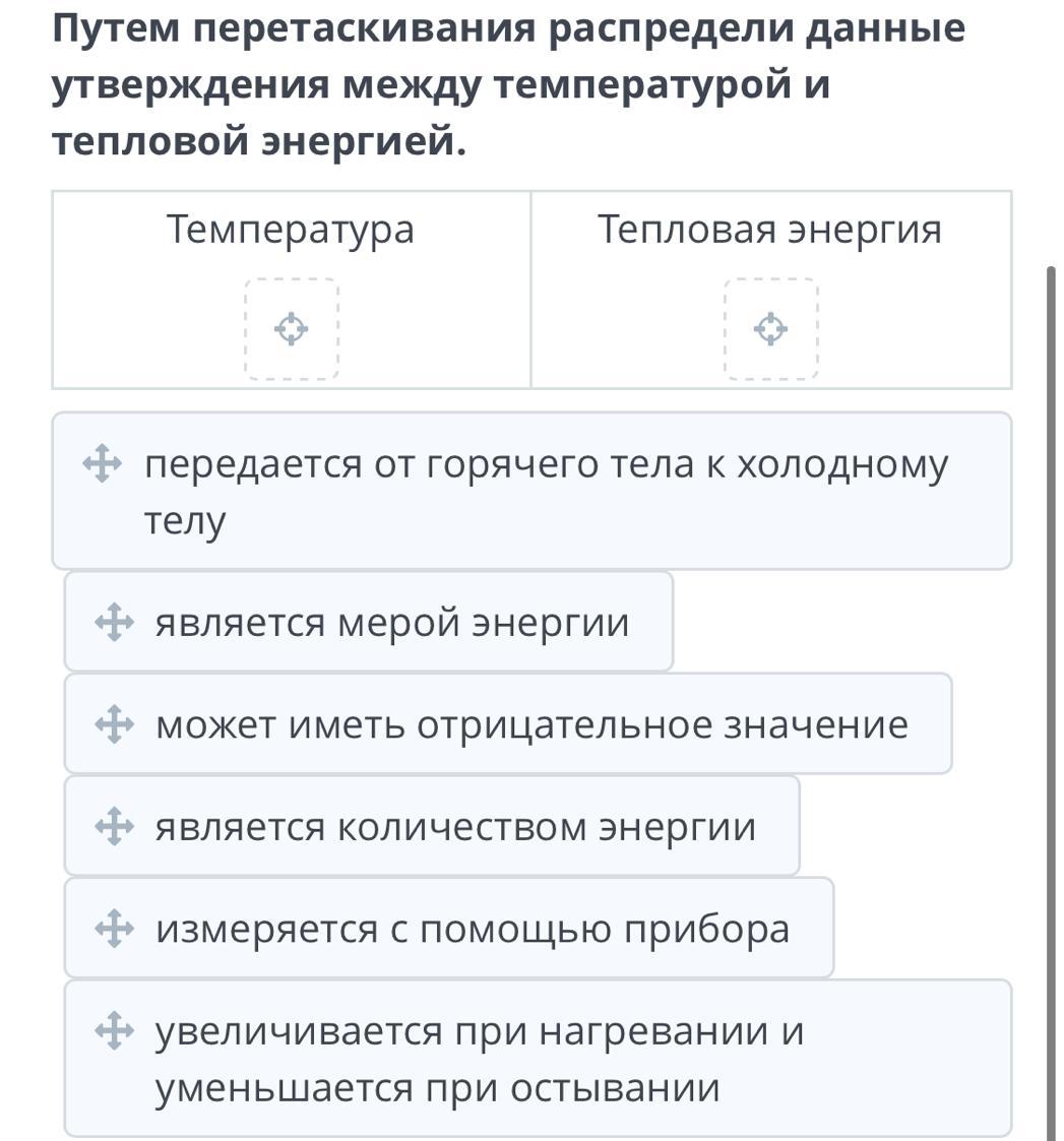 Путём перетаскивания распредели данные утверждения между температурой и тепловой энергией