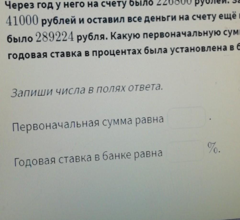 Через год у него на счету было 226800 рублей. Затем он положил на свой счёт в банке ещё 41000 руб и оставил все деньги на счету ещё на год. В итоге к концу второго года на счету было 289224 рублей. Какую первоначальную сумму Семён положил на счёт в банк и какая годовая ставка в процентах была установлена в банке?
