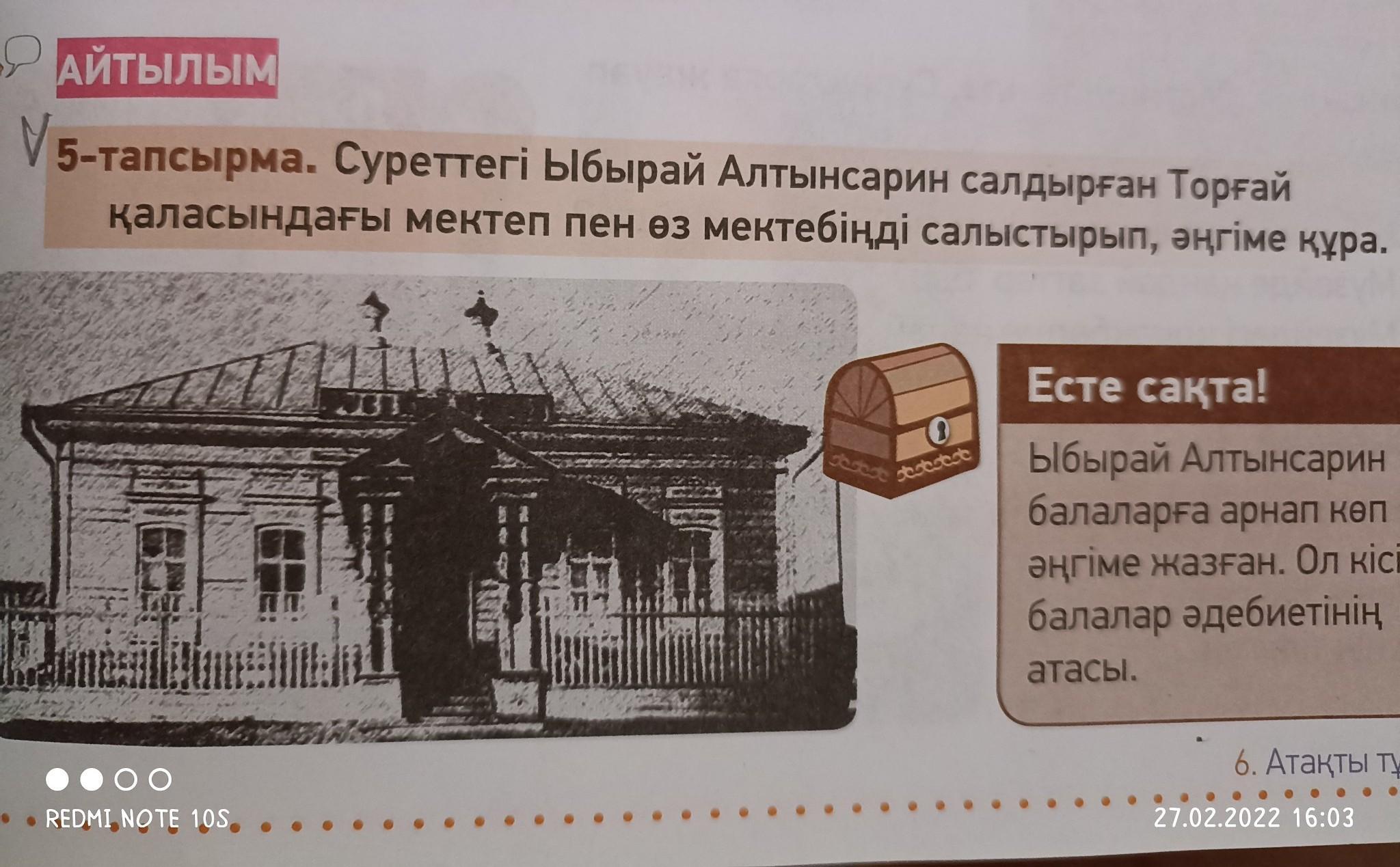 АЙТЫЛЫМ V5-тапсырма. Суреттегі Ыбырай Алтынсарин салдырған Торғай қаласындағы мектеп пен өз мектебіңді салыстырып, әңгіме құра.