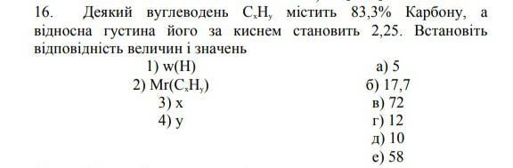 деякий вуглеводень схну містить 83,3% карбону, а відносна частина його за киснем становить 2,25. Встановіть відповідність величин і значень