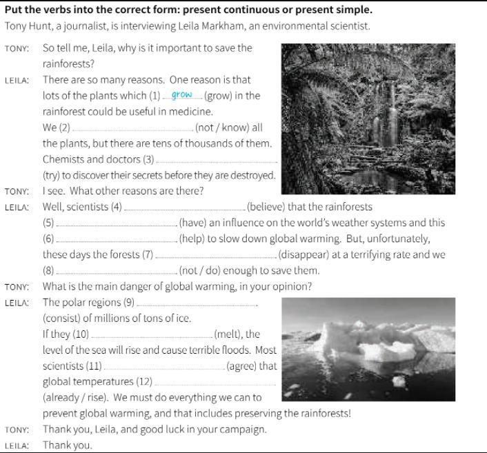 2.don't know, 3.try 4. believe 5.have 6.helps 7. are disappearing 8. are not doing enough 9.consist 10. melt 11.agree 12. are already rising