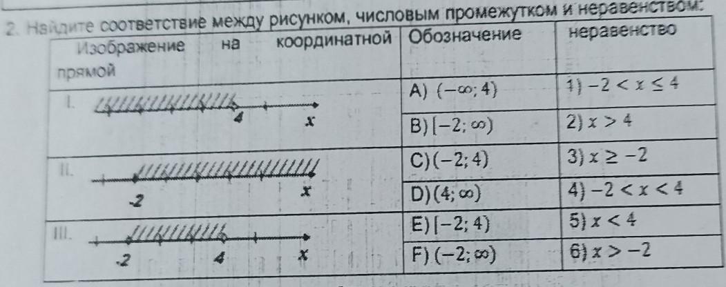 На первом рисунке: х(какое-то число) принадлежит множеству отрицательных чисел(от минус бесконечности) до 4 не включительно (кружок не закрашен, это 4). Всё, что после 4 (и само число 4) не является решением неравенства (какого-то).