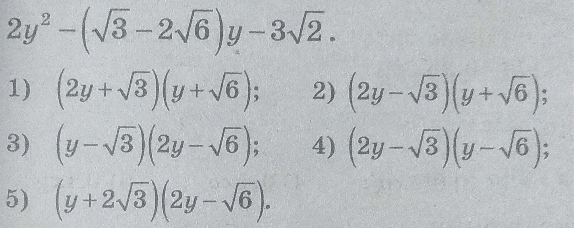 1)2y^2+2y\sqrt{6} +y\sqrt{3} +3\sqrt{2} \\3)2y^2-y\sqrt{6} -2y\sqrt{3} +3\sqrt{2} \\5) 2y^2-y\sqrt{6} +4y\sqrt{3} -6\sqrt{2} \\2) 2y^2+2y\sqrt{6} -y\sqrt{3} -3\sqrt{2} \\4) 2y^2 -2y\sqrt{6} -y\sqrt{3} +3\sqrt{2}
