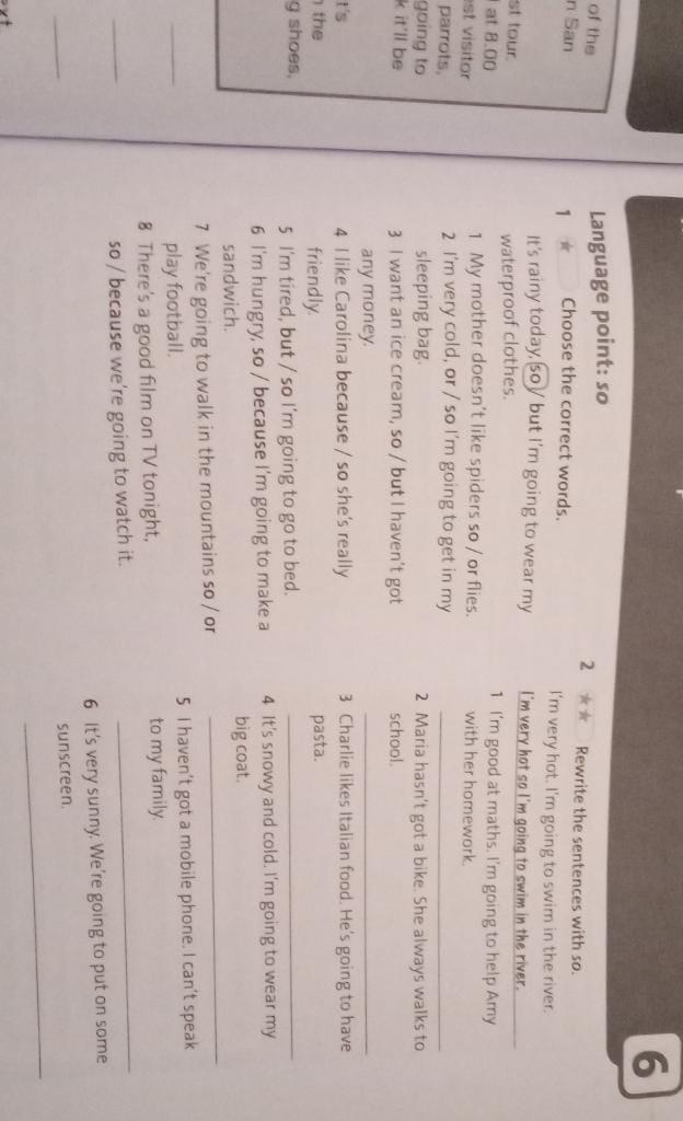 2/1. в этом задании спишешь первое предложение, после него - слово so, а потом - второе предложение начнешь с маленькой буквы ( как в образце).