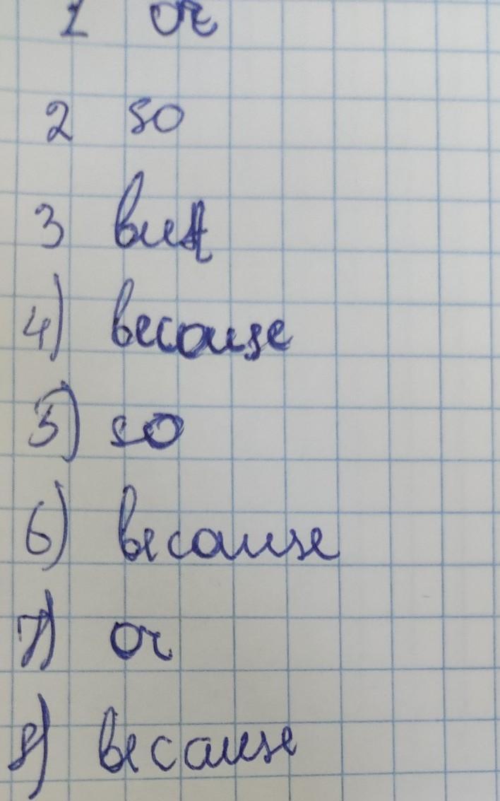 1. or 2. so 3.but 4. because 5. so 6. so 7. or 8. so