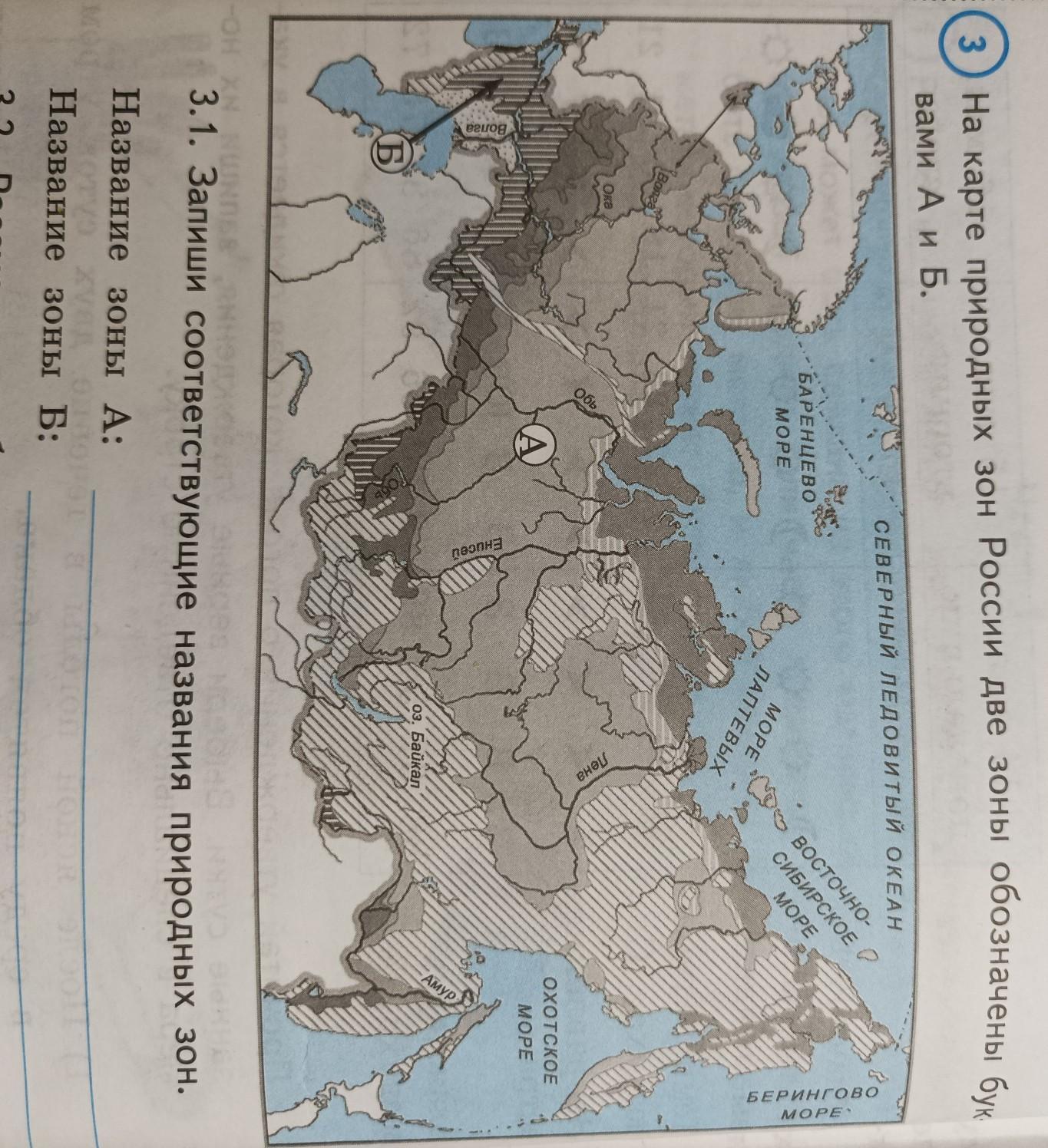 На карте природных зон России две зоны обозначены буквами А и Б 3.1 Запиши соответствующие названия природных зон. Название зоны А: Название зоны Б: