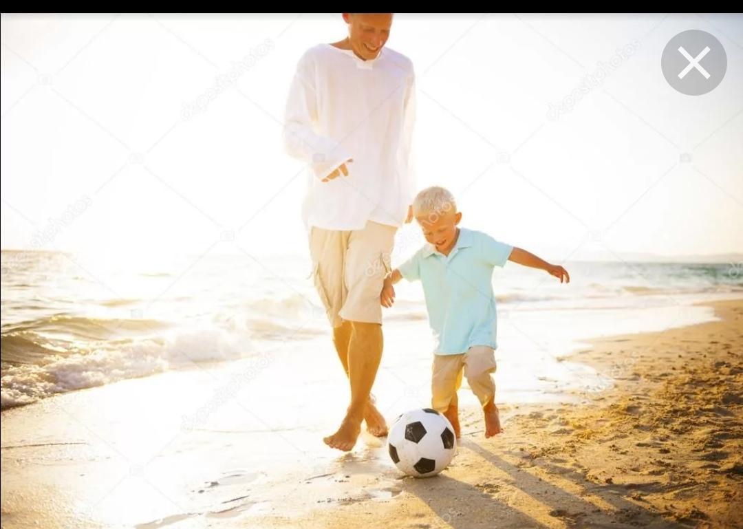 This picture shows how father and son are walking on the sea. In the background we have the sea and a very bright sun. Father and son are walking along the beach. The son kicks the ball. They feel joy. The rays of the sun that adorn this picture. Luzurious sea that creates the sound of calm. This is their happiness. Their happy smiles.