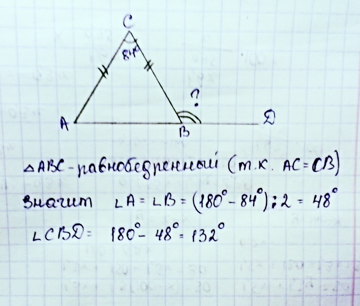 В треугольнике АBC стороны АС и BC равны,угол С равен 84 градуса.Найдите внешний угол СВD.Ответ в градусах.