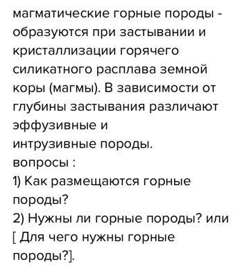 Ответ: 1) Конечные продукты магматической деятельности, возникшие в результате затвердевания природного расплава. Переход расплава в твёрдое состояние сопровождается кристаллизацией вещества.