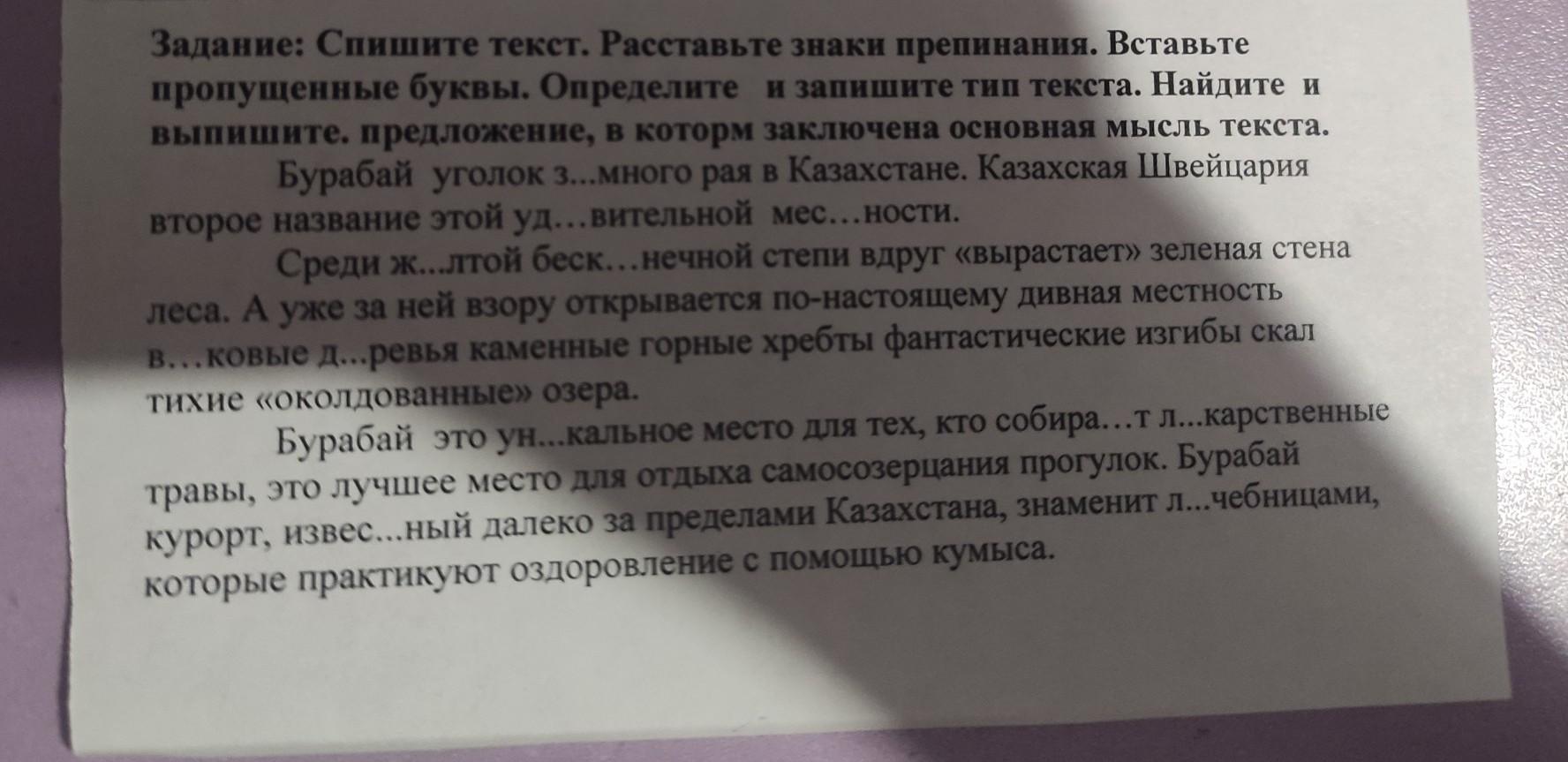 Задание: Спишите текст. Расставьте знаки препинания. Вставьте пропущенные буквы. Определите и запишите тип текста. Найдите и выпишите, предложение, в которм заключена основная мысль текста. Бурабай уголок з...много рая в Казахстане. Казахская Швейцария второе название этой уд...вительной мес...ности. Среди ж...лтой беск...нечной степи вдруг «вырастает» зеленая стена леса. А уже за ней взору открывается по-настоящему дивная местность в...ковые д...ревья каменные горные хребты фантастические изгибы скал тихие «околдованные» озера. Бурабай это ун...кальное место для тех, кто собира...тл...карственные травы, это лучшее место для отдыха самосозерцания прогулок. Бурабай курорт, извес...ный далеко за пределами Казахстана, знаменит л...чебницами, которые практикуют оздоровление с помощью кумыса.