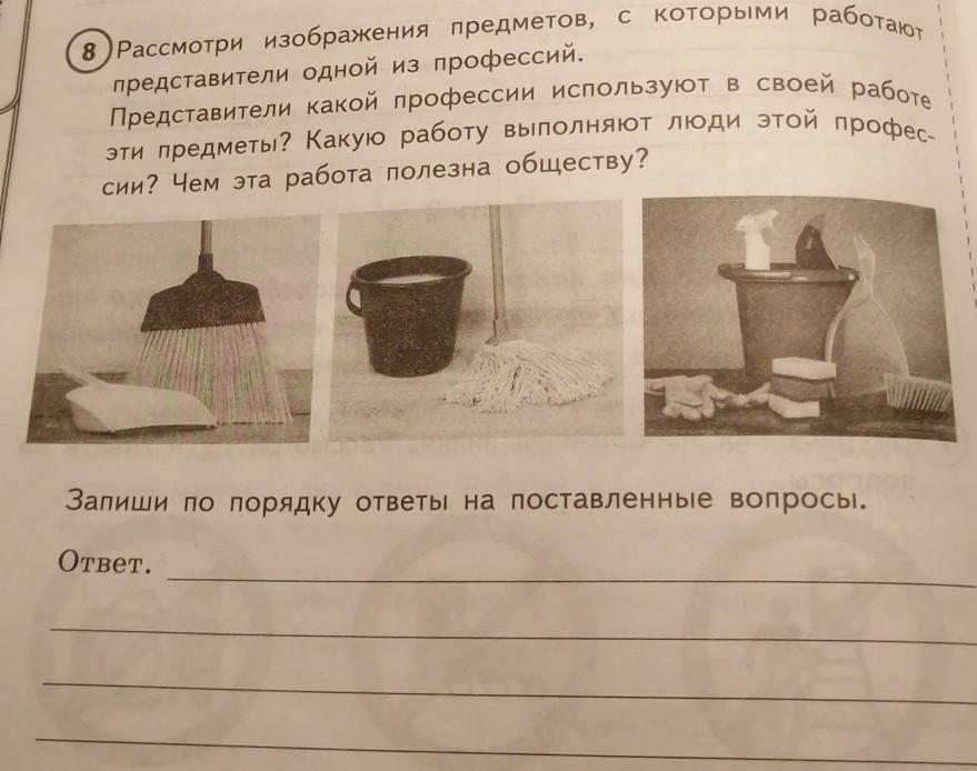 (8) Рассмотри изображения предметов, с которыми работают представители одной из профессий. Представители какой профессии используют в своей работе эти предметы? Какую работу выполняют люди этой профес- сии? Чем эта работа полезна обществу? Запиши по порядку ответы на поставленные вопросы.