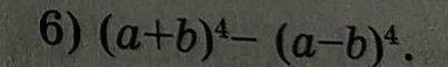 Получаем: (a + b)^4 - (a - b)^4 = ((a + b)^2)^2 - ((a - b)^2)^2 = ((a + b)^2 - (a - b)^2) * ((a + b)^2 + (a - b)^2) = (a^2 + 2 * a * b + b^2 - (a^2 - 2 * a * b + b^2)) * (a^2 + 2 * a * b + b^2 + a^2 - 2 * a * b + b^2) = (a^2 + 2 * a * b + b^2 - a^2 + 2 * a * b - b^2) * (a^2 + b^2 + a^2 + b^2) = (2 * a * b + 2 * a * b) * (a^2 + b^2 + a^2 + b^2) = 4 * a * b * (2 * a^2 + 2 * b^2) = 8 * a * b * (a^2 + b^2).