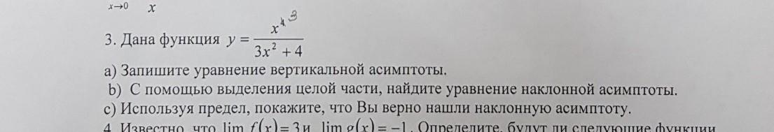 дана функция: a) запишите уравнение вертикальной асимптоты. b) с помощью выделения целой части, найдите уравнение наклонной асимптоты. c) используя, предел, покажите, что вы верно нашли наклонную асимптоту (степень исправлена, так должно быть)