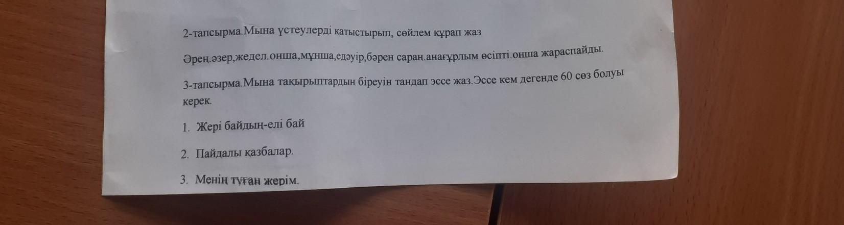 Менің туып өскен жерім - егеменді Қазақстан. Қазақстанның байлығы өте көп және қазынаға бай ел. Біздің еліміздің табиғаты өте сұлу. Биік-биік асқар тау, мөп-мөлдір көлдер, неше түрлі өсімдіктер мен дәрілік қасиеті бар шөптер өседі. Қазақстан жерінде аңдар мен құстар, неше түрлі жануарлар жасайды. Сол жерде біздің ата-бабаларымыз, батырларымыз, ақындарымыз, ғалымдарымыз туып өскен. Қазақстандай жері шұрайлы, шөбі шүйгін өлкені мен әрқашан да мақтан тұтамын.Қазақстанның кең даласындай байтақ дала еш жерде жоқ шығар.