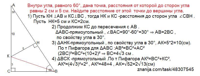до сторон угла равны 2 см и 5 см. Найдите расстояние от этой