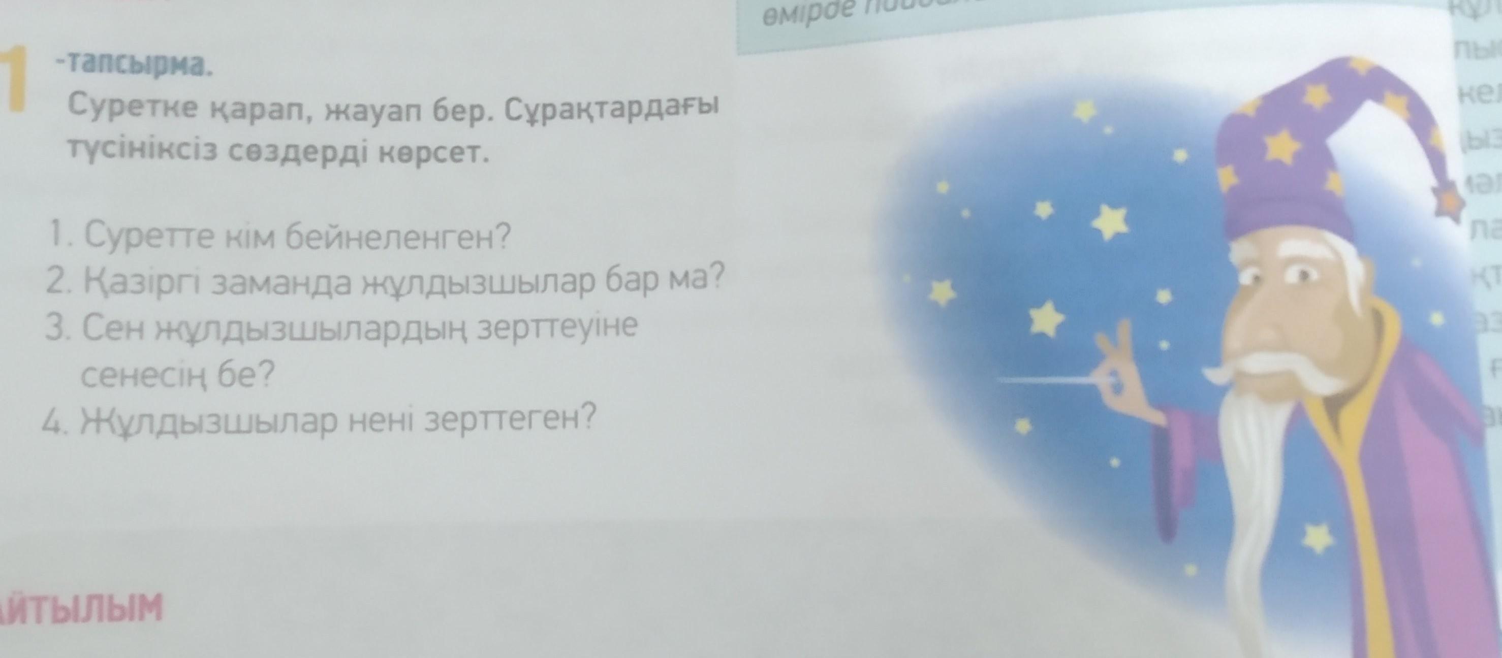 1-тапсырма. Суретке қарап, жауап бер. Сұрақтардағы түсініксіз сөздерді көрсет. 1. Суретте кім бейнеленген? 2. Қазіргі заманда жұлдызшылар бар ма? 3. Сен жұлдызшылардың зерттеуіне сенесің бе? 4. Жұлдызшылар нені зерттеген?