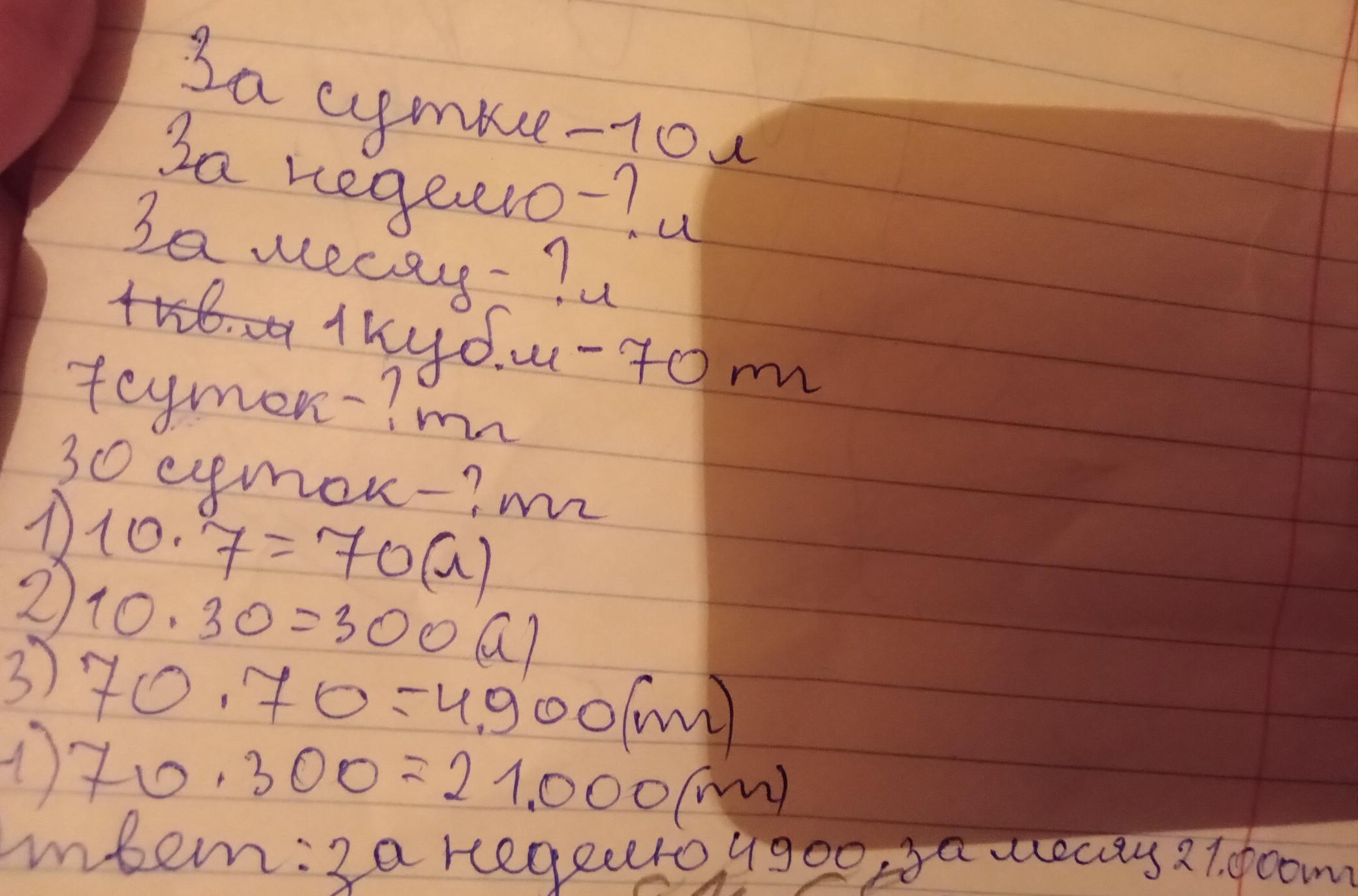 1 Реши задачу. При утечке из крана воды за сутки набегает примерно 10 литров — целое ведро. Сколько вёдер воды утечёт без пользы за неделю? Месяц? Какой вред это наносит природе? Если 1 кубический метр воды стоит 70 тенге, то как утечка воды отразится на семейном бюджете?