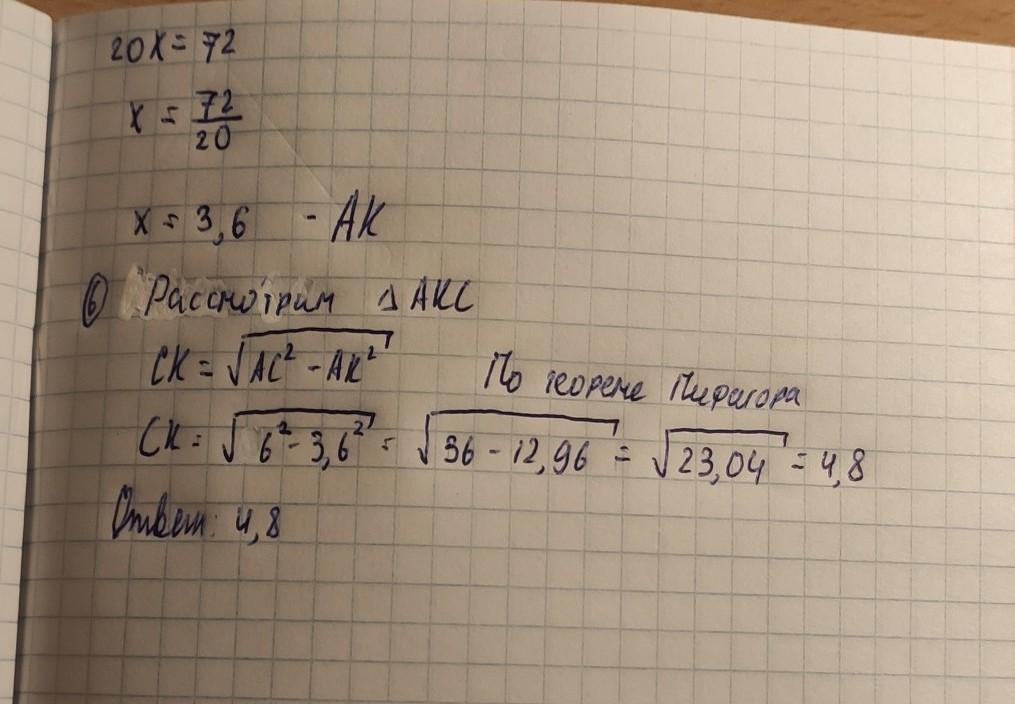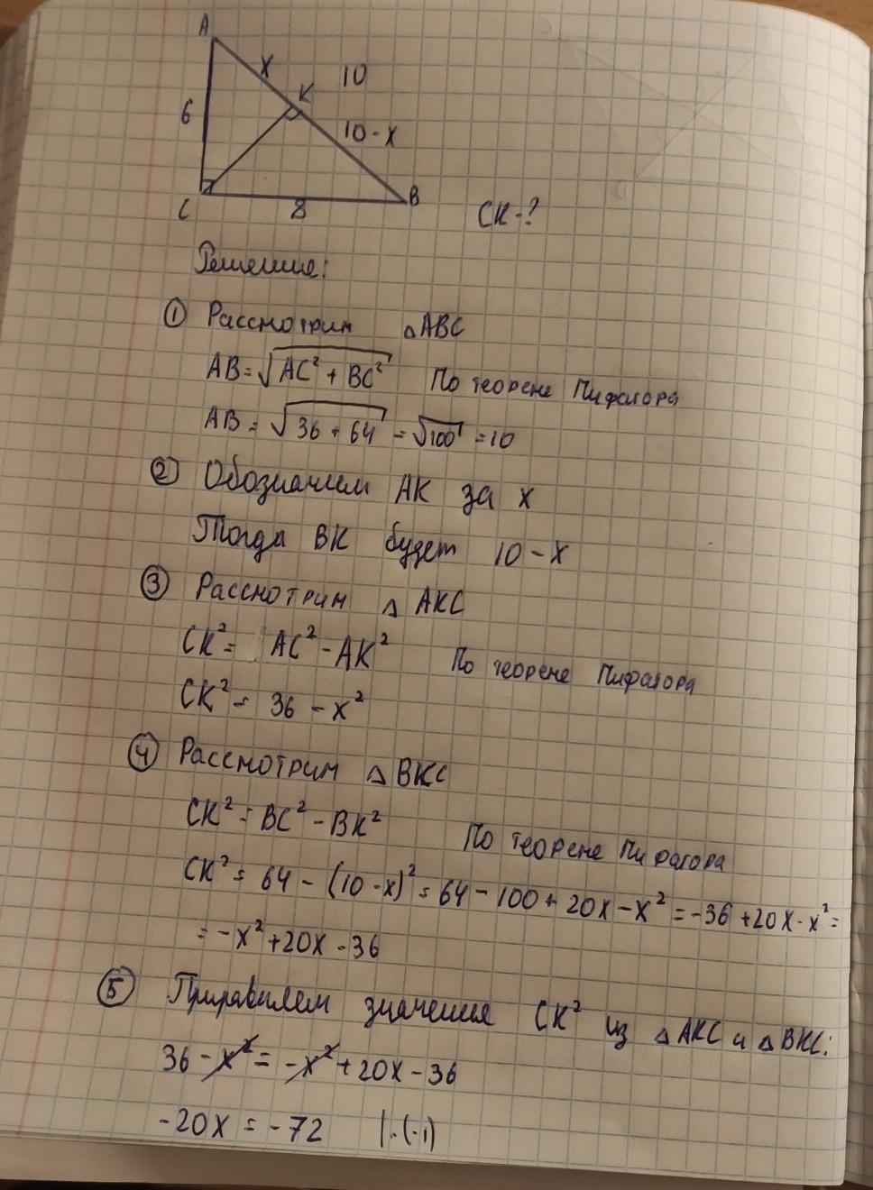 в прямоугольном треугольнике ABC с прямым уголом С провели высоту CK, причем AC = 6, BC= 8. Найдите СК.