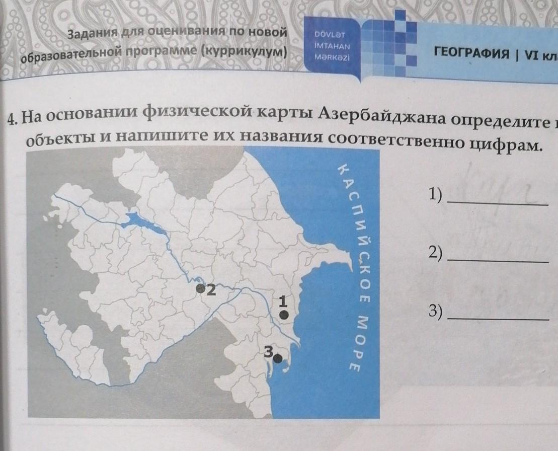 4. На основании физической карты Азербайджана уределителен продуктивни объекты и напишите их названия соответственно цифрам.
