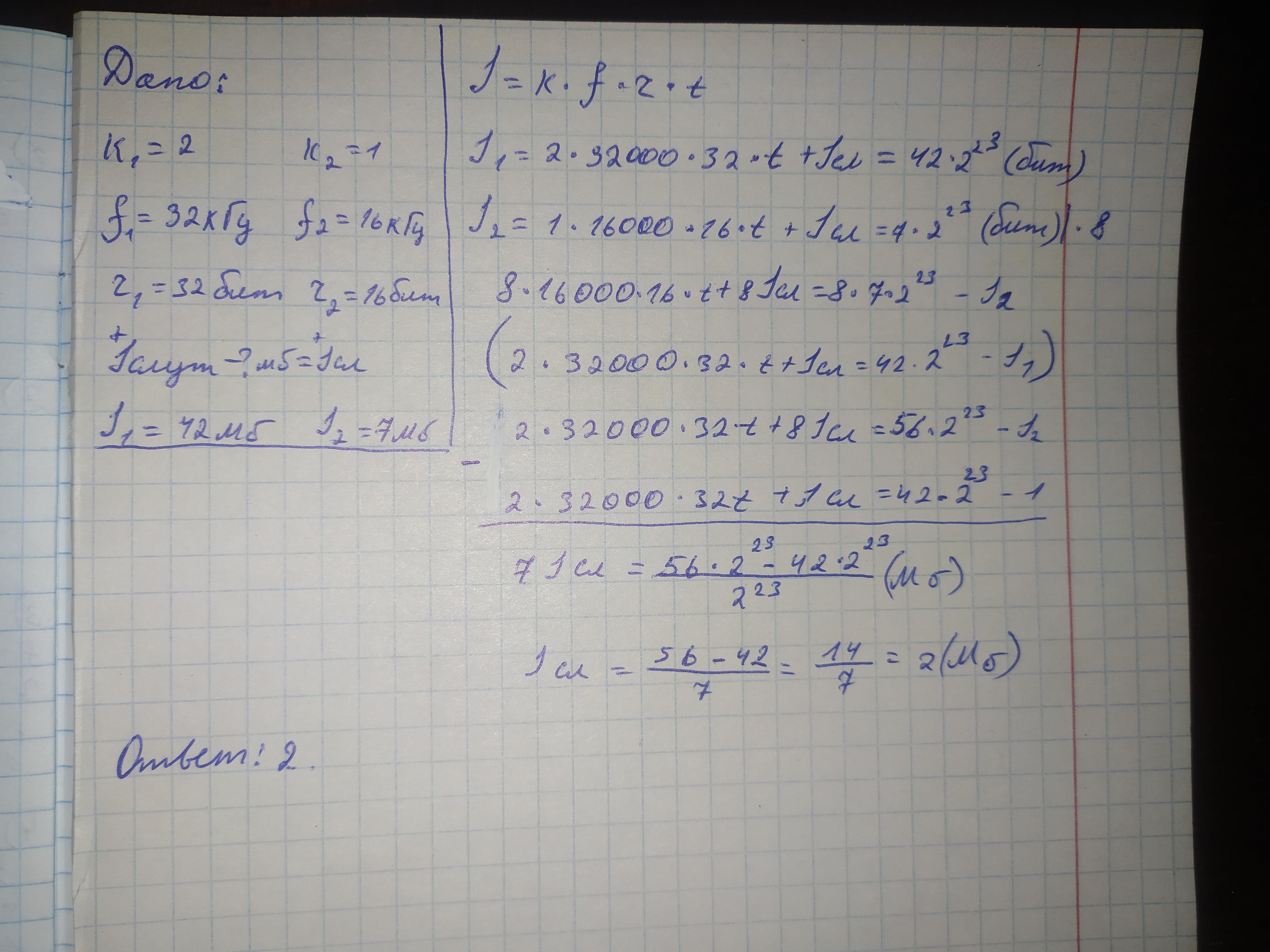 Для проведения эксперимента записывается звуковой фрагмент в формате стерео (двухканальная запись) частотой дискретизации 32 кГц и 32- битным разрешением. Результаты записываются в файл, сжатие данных н производится; дополнительно в файл записывается служебная информация, необходимая для эксперимента, размер полученного файла 42 Мбайт. Затем производится повторная запись этого ж фрагмента в формате моно (одноканальная запись) с частотой дискретизации 16 кГц и 16-битным разрешением. Результаты тоже записываются в файл без сжатия и со служебной информацией, размер полученного файла 7 Мбайт. Объём служебной информации в обоих случаях одинаков. Укажите этот объём в мегабайтах. В ответе укажите только число (количество Мбайт), единицу измерения указывать не надо.