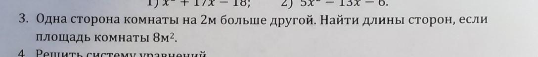 Объяснение:Если площадь комнаты 8м², то x * (x + 2) = 8 x² + 2x — 8 = 0 D = 2² — 4 * 1 * (- 8) = 4 + 32 = 36 = 6² x = — 4 — не подходит Значит длина одной стороны комнаты 2 м, а другой 2 + 2 = 4 м.