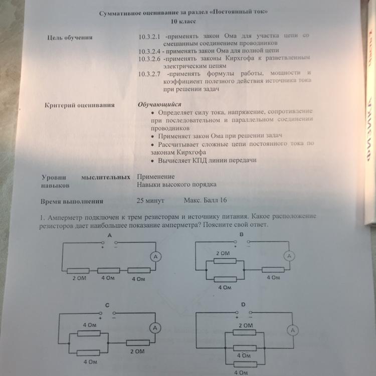 Ответ: наибольшее показание амперметра будет в варианте D.