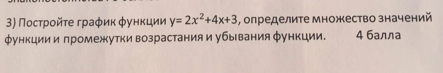3) Постройте график функции y= 2х2 +4х+3, определите множество значений функции и промежутки возрастания и убывания функции. 4 балла