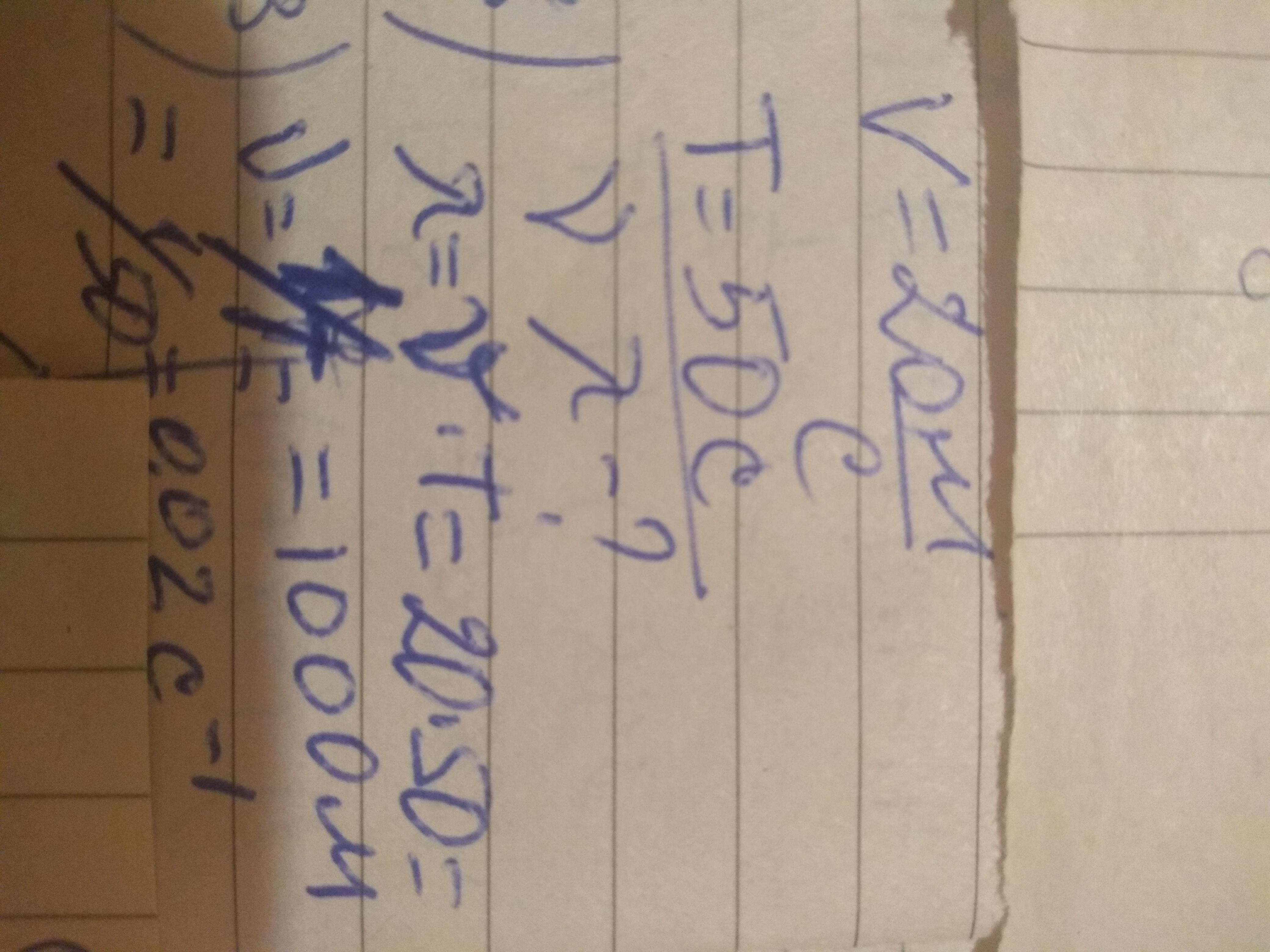Вдоль упругого шнура распространяется поперечная волна со скоростью 20 м/с/ период колебаний точек шнкра 50 м/с. определите частоту и длину волны