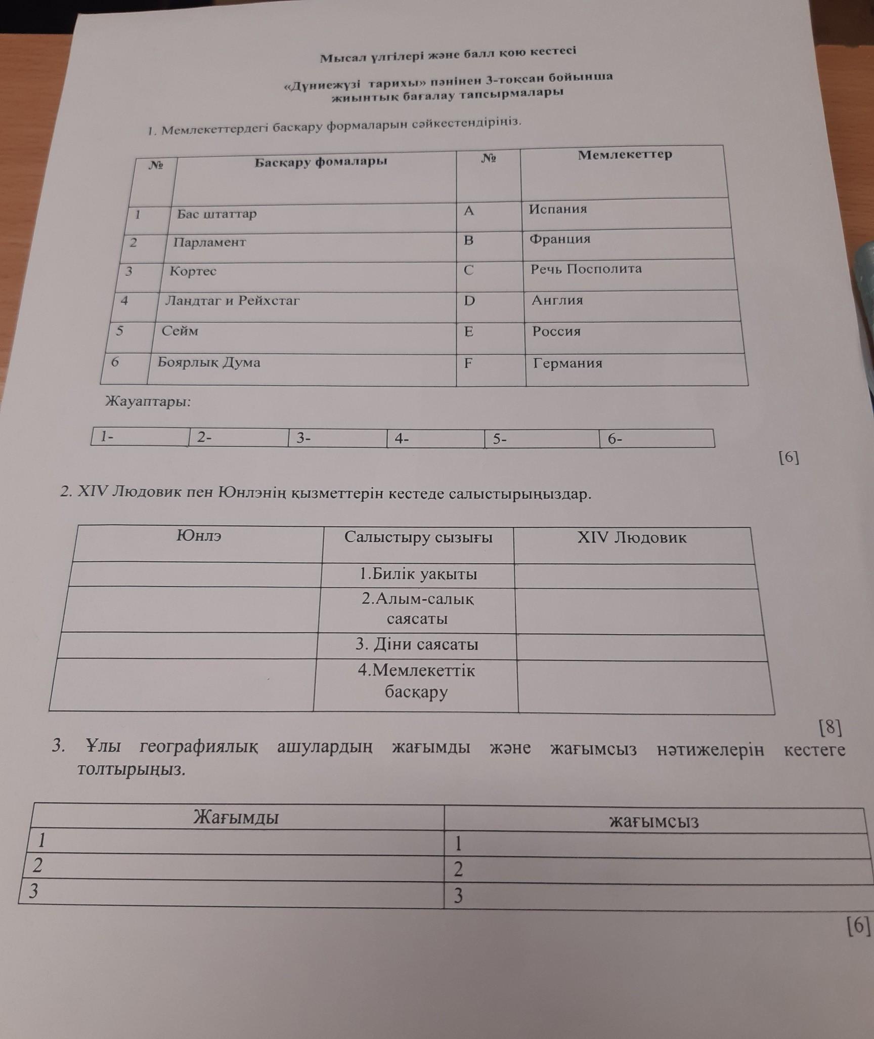 дүниежүзі тарихы 3- тоқсан бойынша жиынтық бағалау тапсырмалары.
