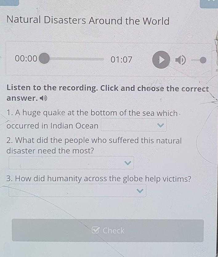 00:00 01:07 Listen to the recording. Click and choose the correct answer. 13 1. A huge quake at the bottom of the sea which occurred in Indian Ocean 2. What did the people who suffered this natural disaster need the most? 3. How did humanity across the globe help victims?