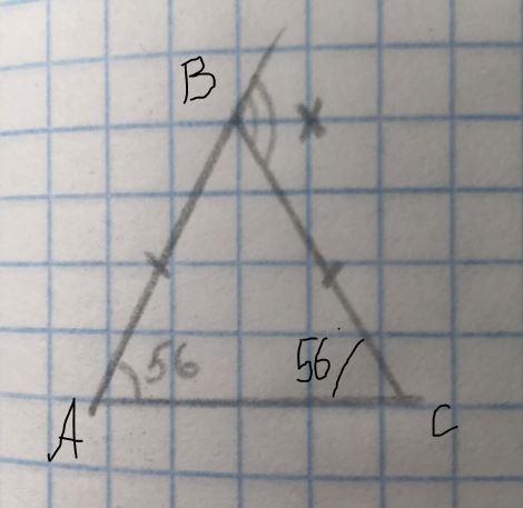 Треугольник равнобедренный ∠А=∠С=56° по свойству.