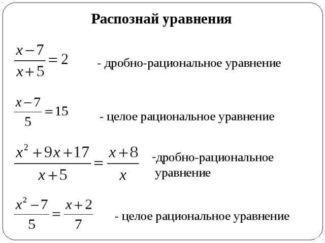 Рациональное уравнение – это равенство двух рациональных (без знака корня) выражений.
