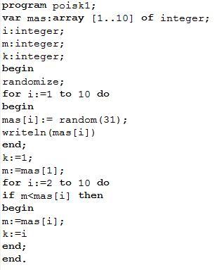 задается значение i-го (1-го, 2-го, 3-го и т.д. до 10-го) элемента массива случайным числом из диапазона [0, 30] (mas[i]:= random(31);)