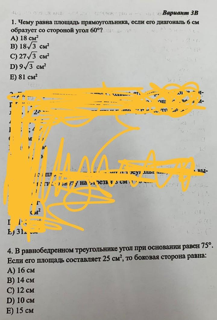 1. Чему равна площадь прямоугольника, если его диагональ образует со стороной угол 60°? А) 18 см? B) 183 см. C) 27/3 см? D) 9/3 см E) 81 см