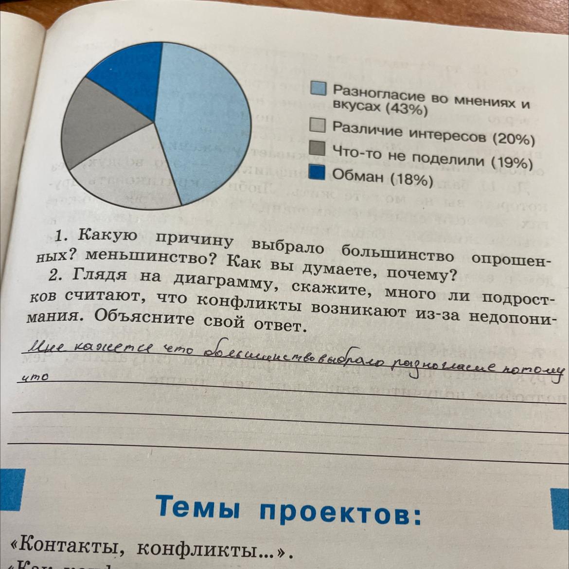 1. Большинство опрошенных выбрало вариант ответа "Разногласие во мнениях и вкусах". Потому что, конфликт - это столкновение противоположных целей, интересов и т.д, так вот каждый человек видит конфликт со своей точки зрения, он излагает свою точку зрения на основе жизненного опыта, поэтому происходит конфликт, потому что мы разные, интересы разные, жизненный опыт разный и т.д
