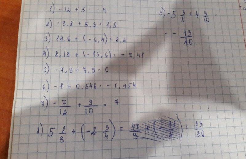 выполните сложение 1) -12 + 5 2) -3,8 + 5,3 3) 14,6 + (-6,4) 4) 8,19 +(-15,6) 5) -7,9 +7,9 6) -1 + 0,546 7) -7/12 + 9/10 8) 5 2/9 + (-2 3/4) 9) -5 3/8 + 4 9/10