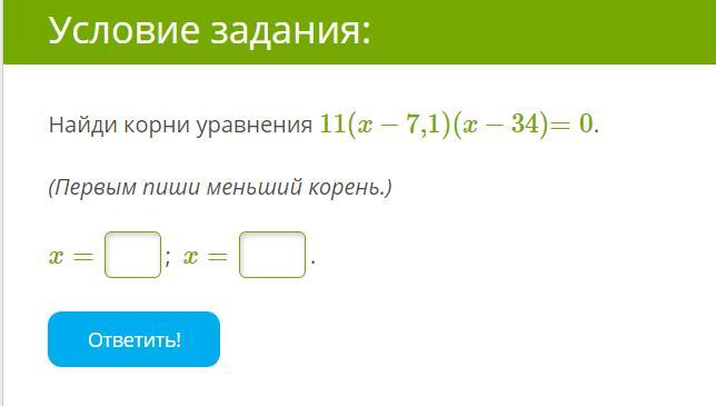 Найди корни уравнения 11(x−7,1)(x−34)=0.