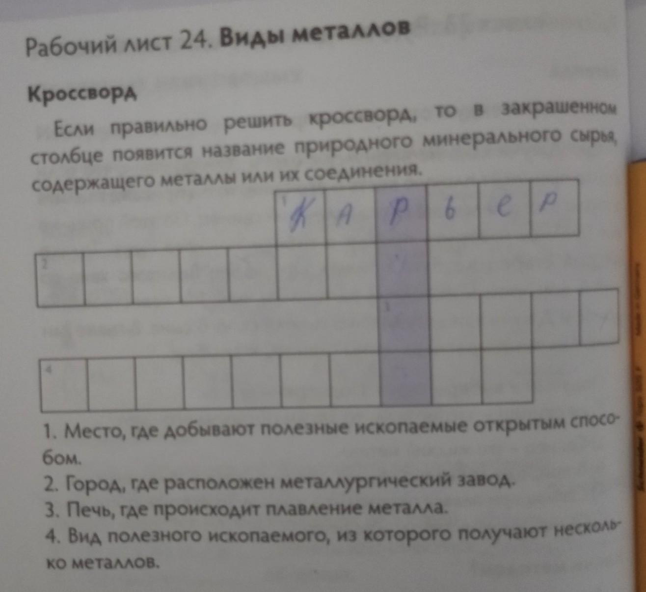Рабочий лист 24. Виды металлов Кроссворд Если правильно решить кроссворд, то в закрашенно- столбце появится название природного минерального сырья, содержащего металлы или их соединения