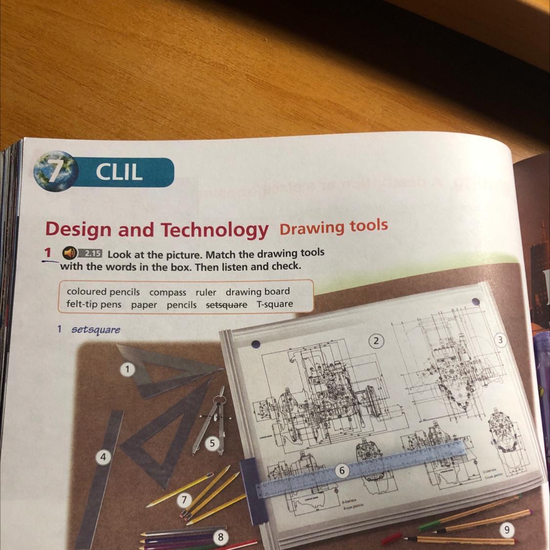 2)paper 3)drawing board 4)ruler 5)compass 6)t-square 7)pencils 8)coloured pencils 9)felt-tip pens