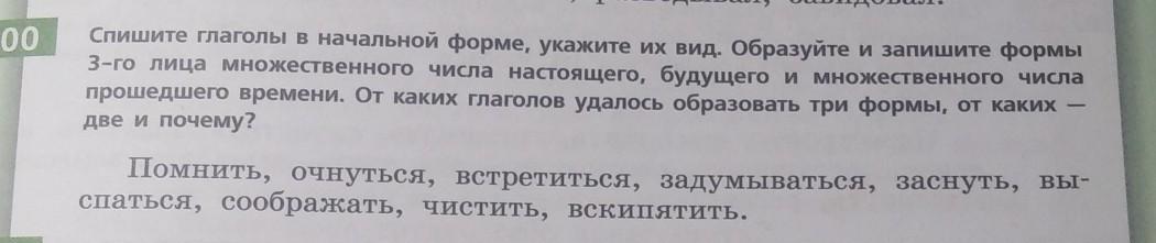 Спишите глаголы в начальной форме, укажите их вид. Образуйте и запишите формы 3-го лица множественного числа настоящего, будущего и множественного числа прошедшего времени. От каких глаголов удалось образовать три формы, от каких две и почему?