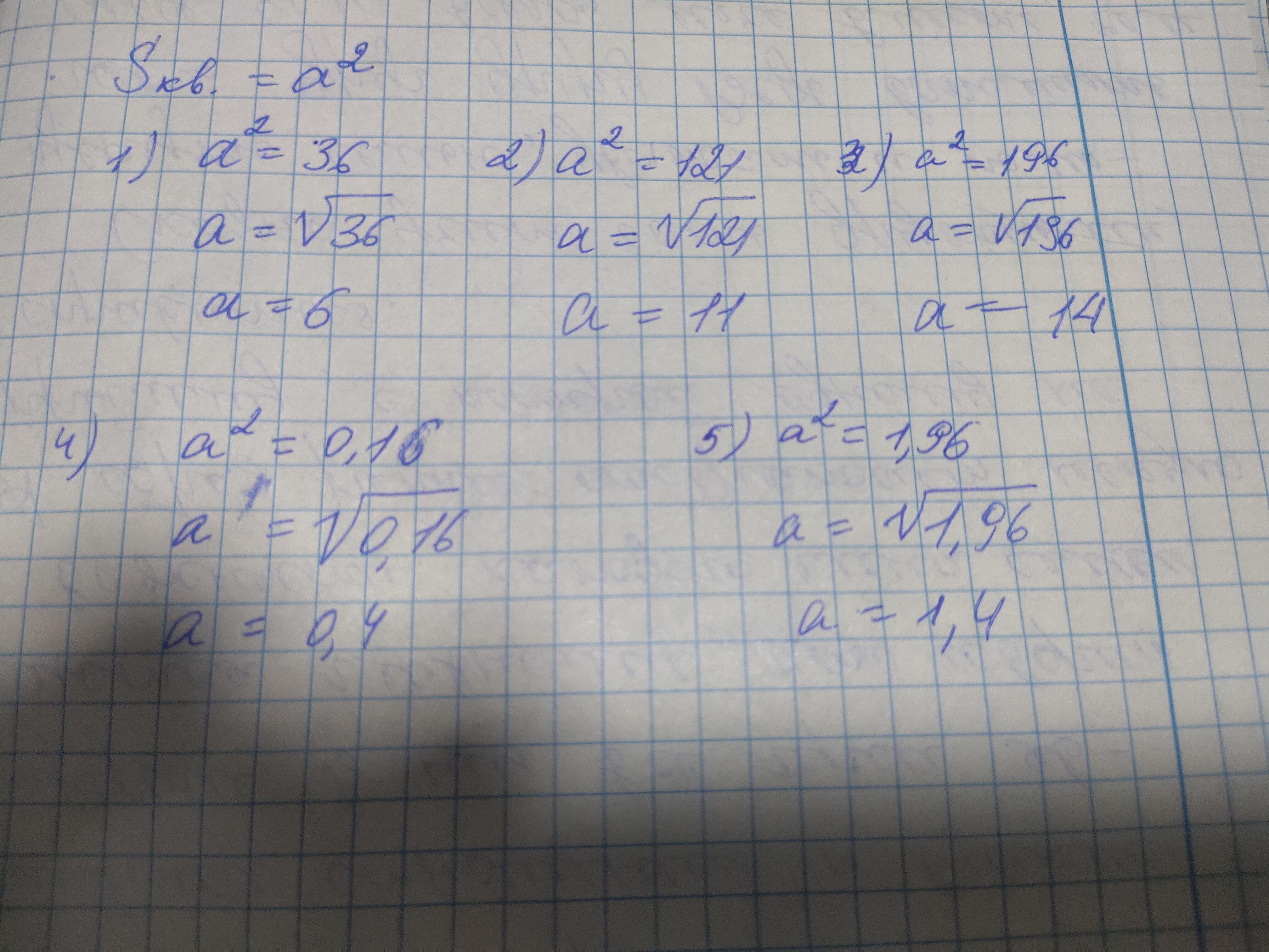 968. Найдите сторону Квадрата, если его Площадь равна: 1) 36 см²; 2) 121 см²; 3) 196 см²; 4) 0,16 дм²; 5) 1,96 см².