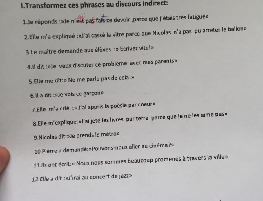 1. Je réponds que je n'ai pas fait ce devoir, parce que j'étais très fatigué