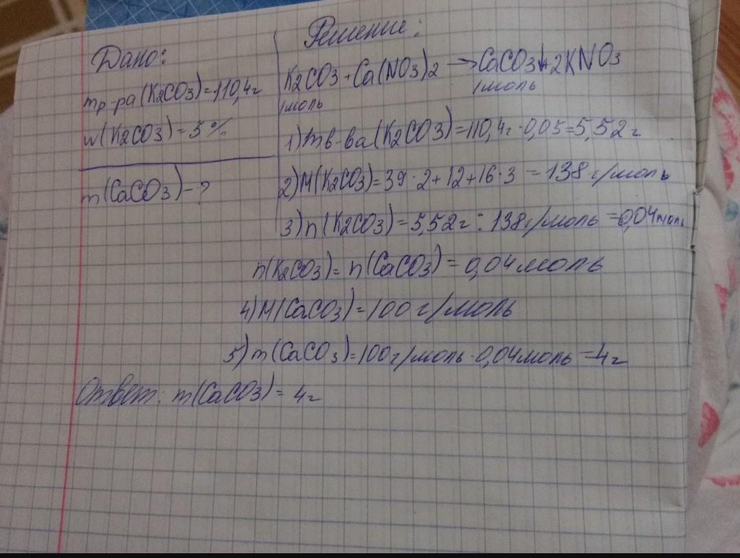 К раствору карбоната калия массой 110,4 г и массовой долей 5% прилили избыток раствора нитрата кальция. Вычислите массу образовавшегося осадка.