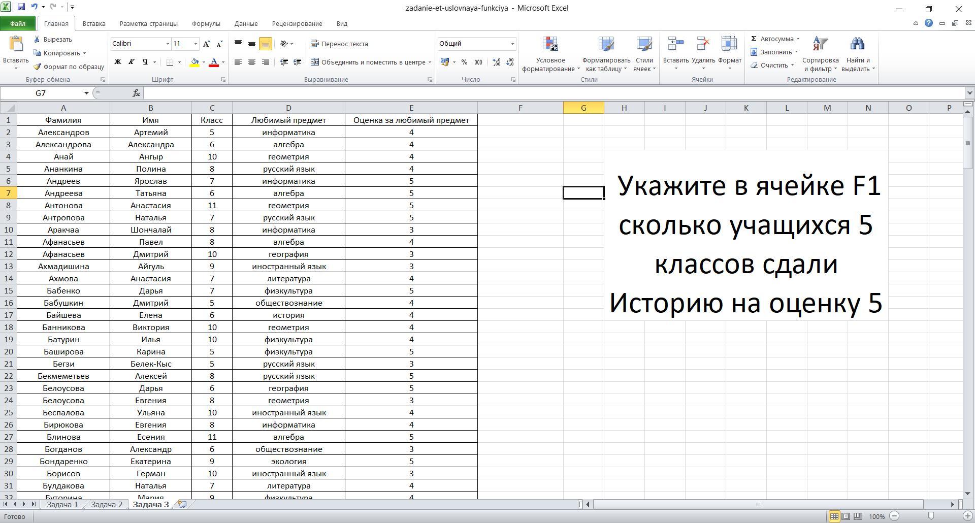 Укажите в ячейке F1 сколько учащихся 5 классов сдали Историю на оценку 5.