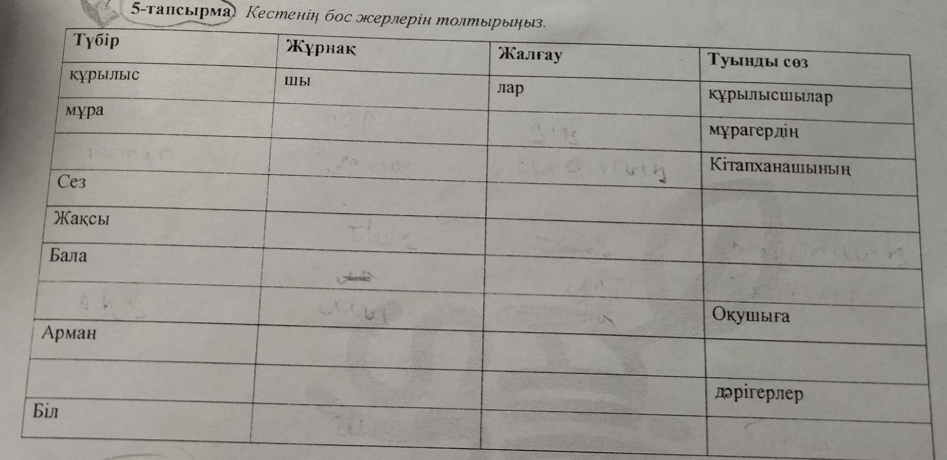 5-тапсырма: Кестенің бос жерлерін толтырыңыз. Түбір Жұрнақ Жалғау Туынды сөз құрылыс ШЫ лар құрылысшылар мұра мұрагердің ging ubinen Кітапханашының АР клі Сез Жақсы Ast 2 ли си и я Бала За дър Оқушыға 2 Mr Арман дәрігерлер Біл
