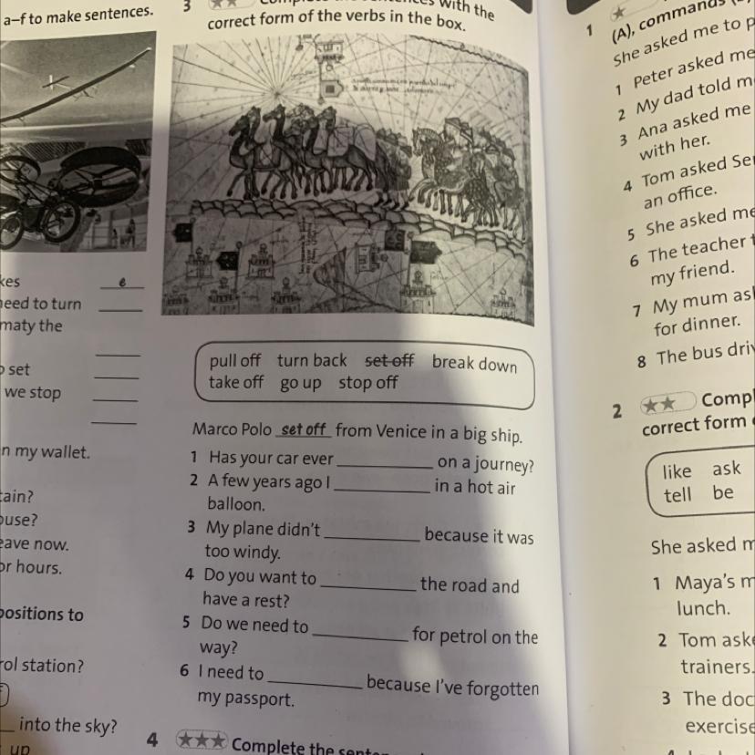 1. break down 2. go up 3. take off 4. pull of 5. stop off 6. turn back
