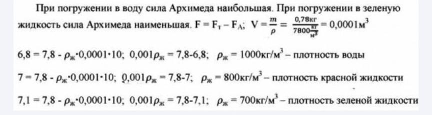 Вес металлического шара равен 7,8 Н. При полном погру- жении в воду подвешенного к динамометру шара показания динамометра равны 6,8 H, при полном погружении шара в подкрашенную красным жидкость показания равны 7 H, а при полном погружении шара в подкрашенную зелёным жид- кость показания равны 7,1 Н. При погружении в какую из трёх жидкостей сила Архимеда наибольшая? наименьшая? Чему равны плотности жидкостей?